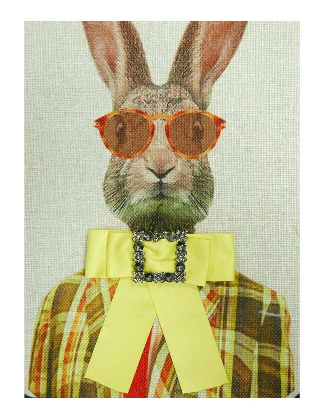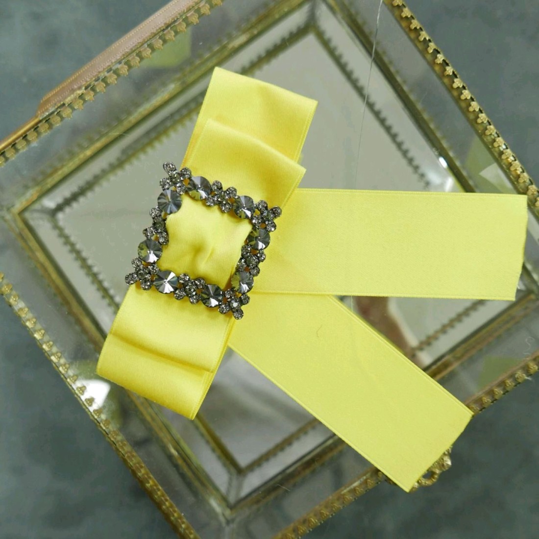 Бант-брошь лимонно-желтого цвета с декором из серых камней и страз