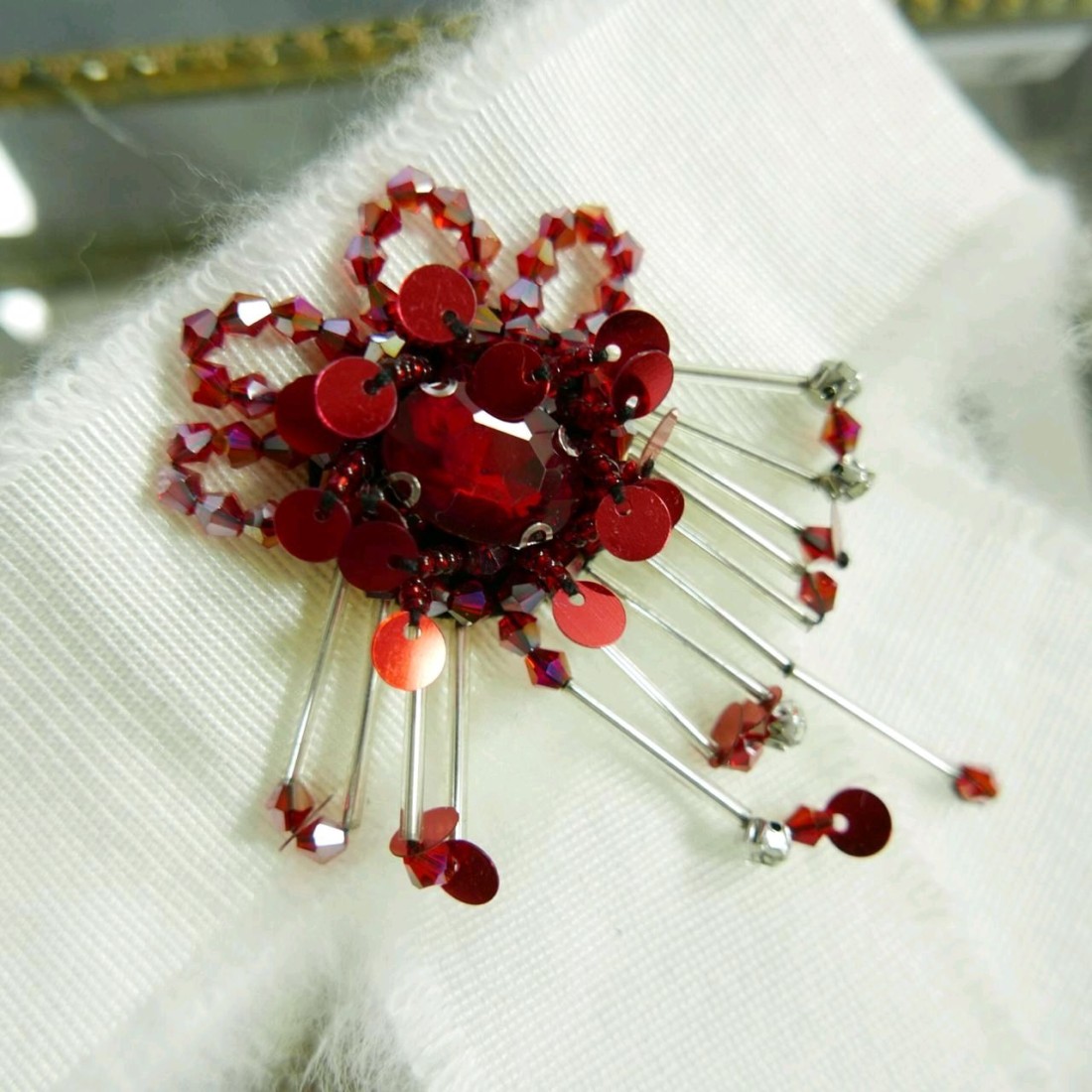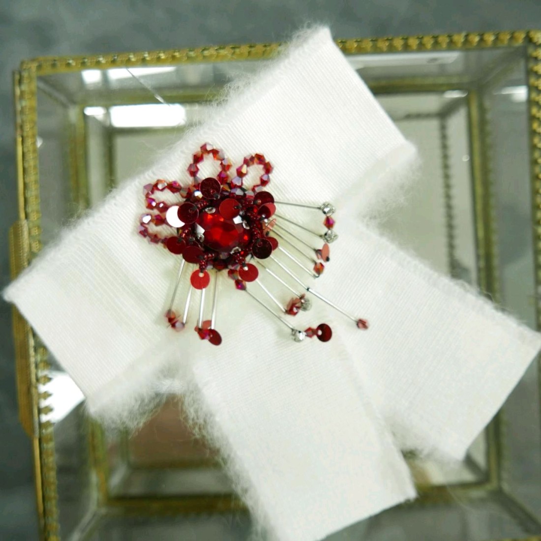 Брошь-бант из пушистой белой мягкой репсовой ленты,дополненный красными пайетками,бисером и стеклярусом,это невероятно красивый аксессуар ,который несомненно станет ключевым в том образе,который вы решите дополнить таким украшением