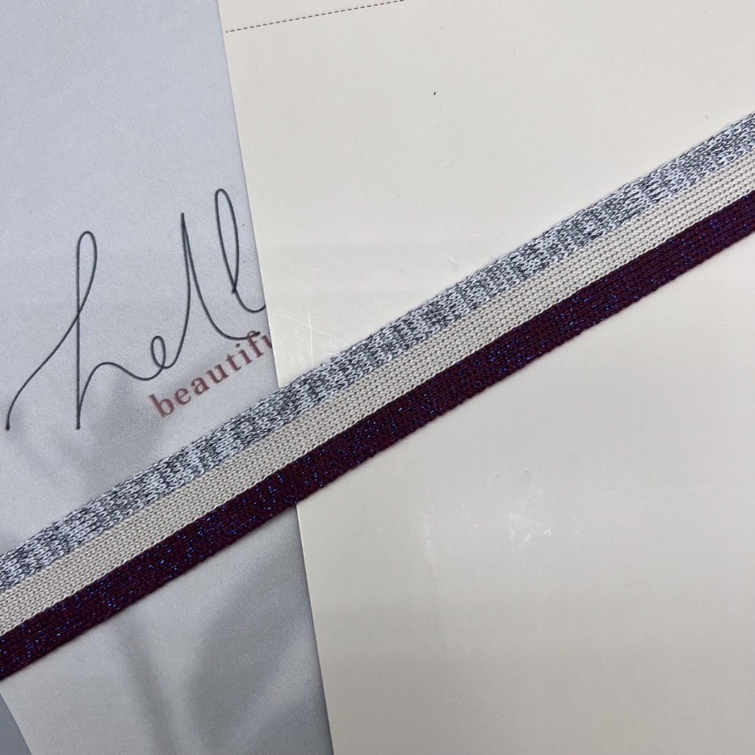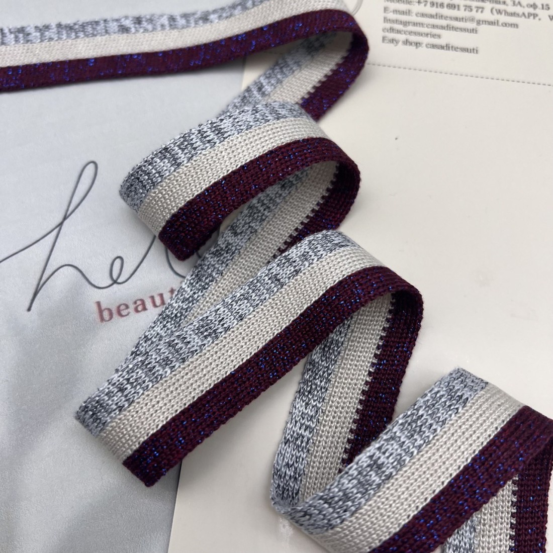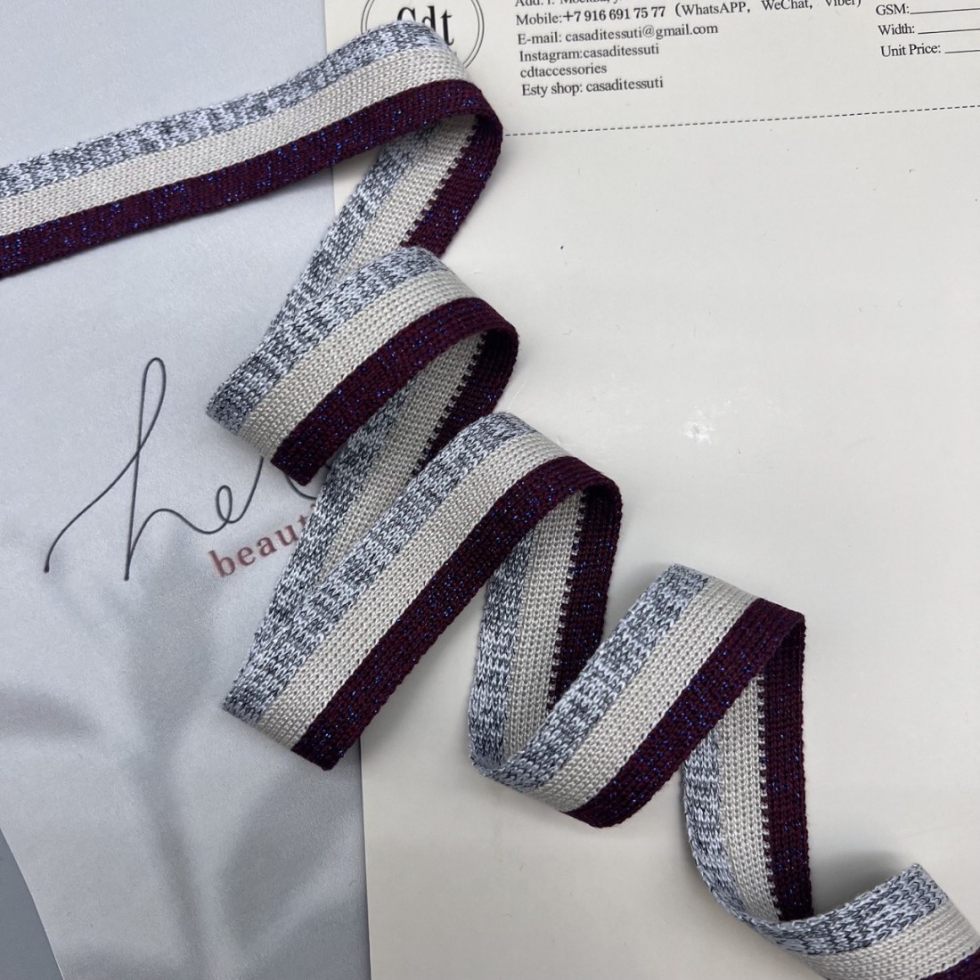 Мягкие трикотажные лампасы для декорирования одежды, сочетание полос в бордово-серых тонах с добавлением люрекса.