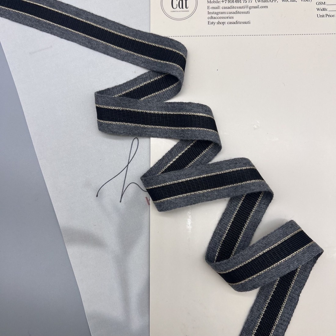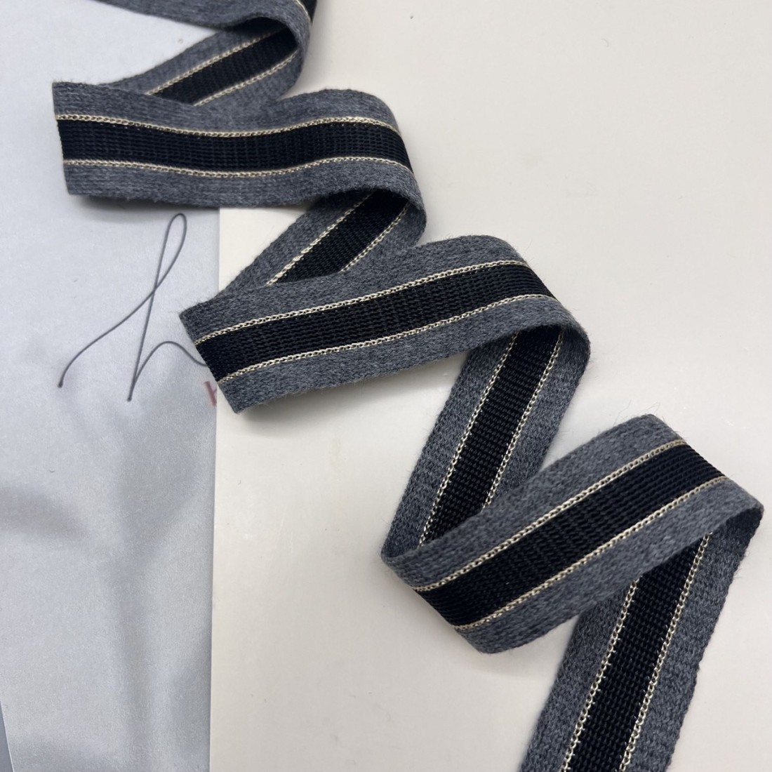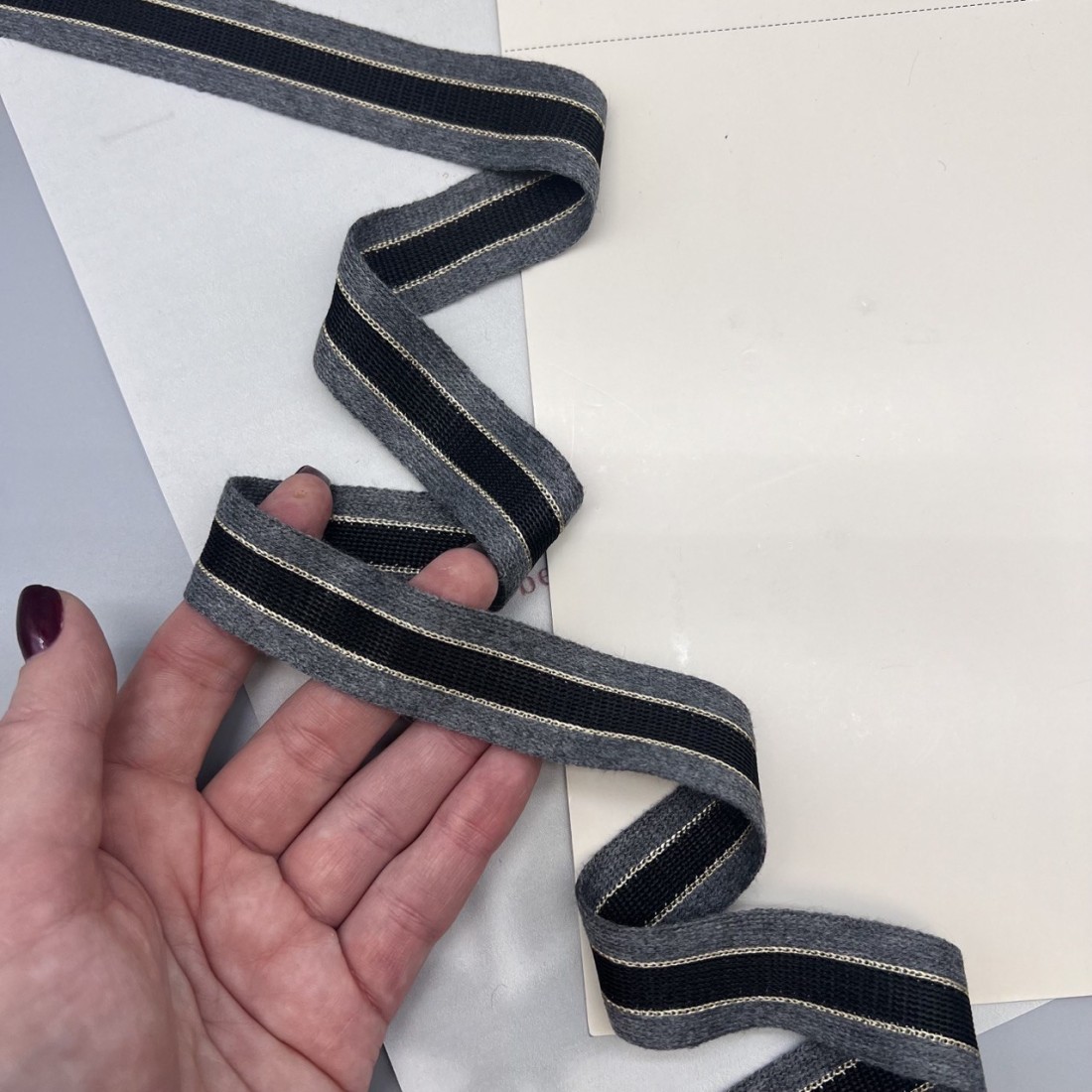 Лампасы трикотажные для декорирования одежды серые с черной и бежевыми полосками. Лампасы из мягкой вискозной нити для шитья.