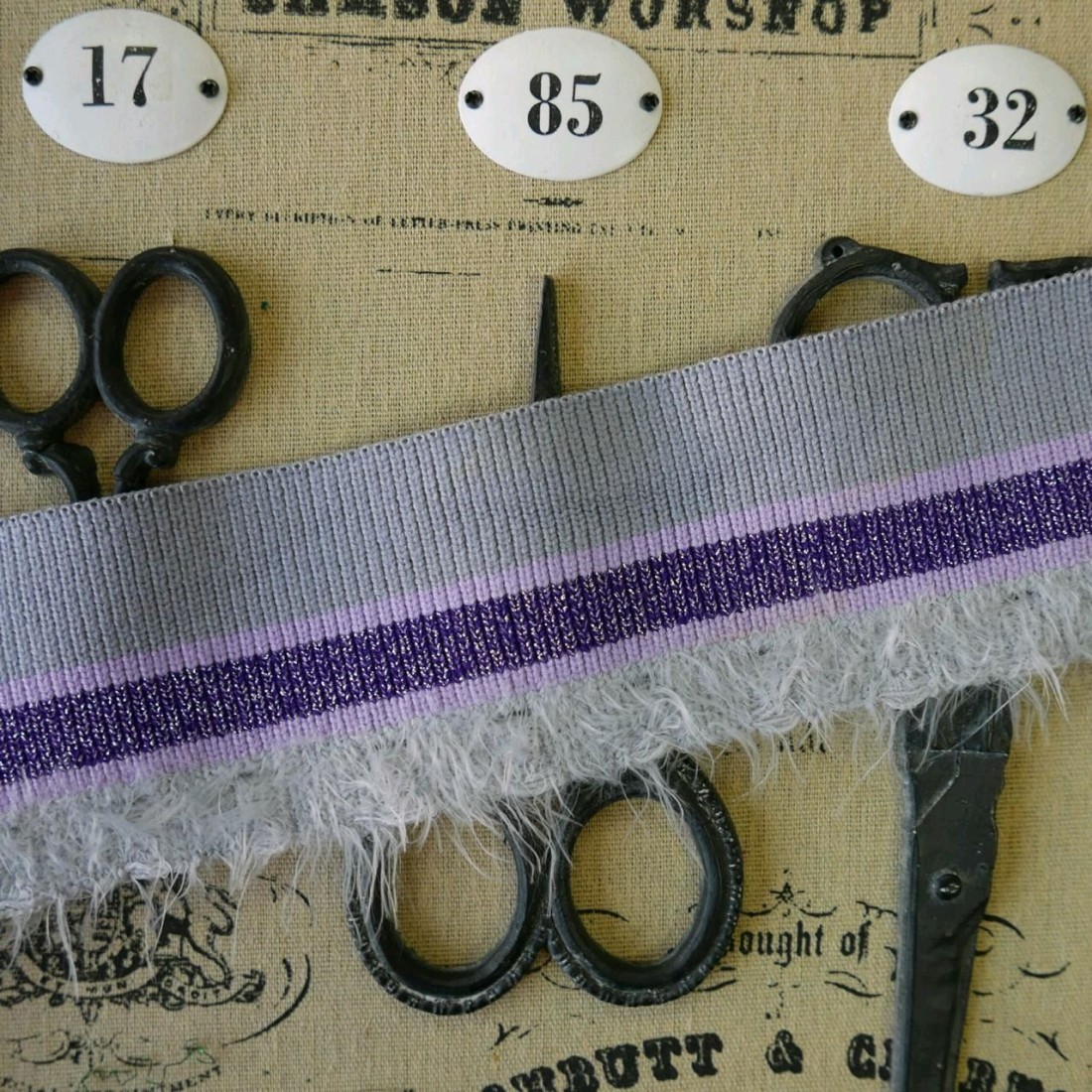 Модные трикотажные подвязы с пушистым краем для плотных тканей : светло -серые с сиреневыми и фиолетовыми полосками отлично подойдут для стеганого бархатного пальто или такой модной в этом сезоне искусственной дубленки.