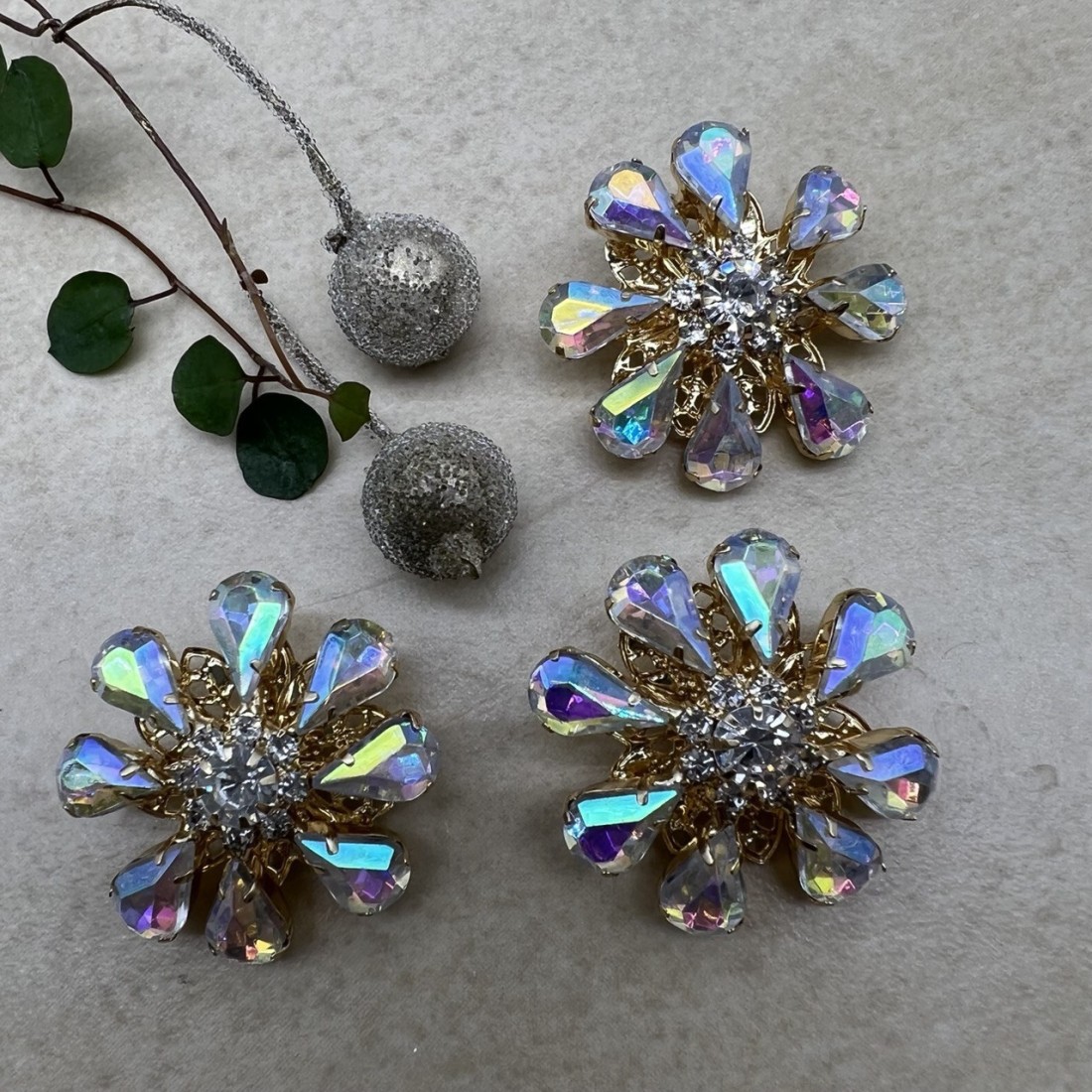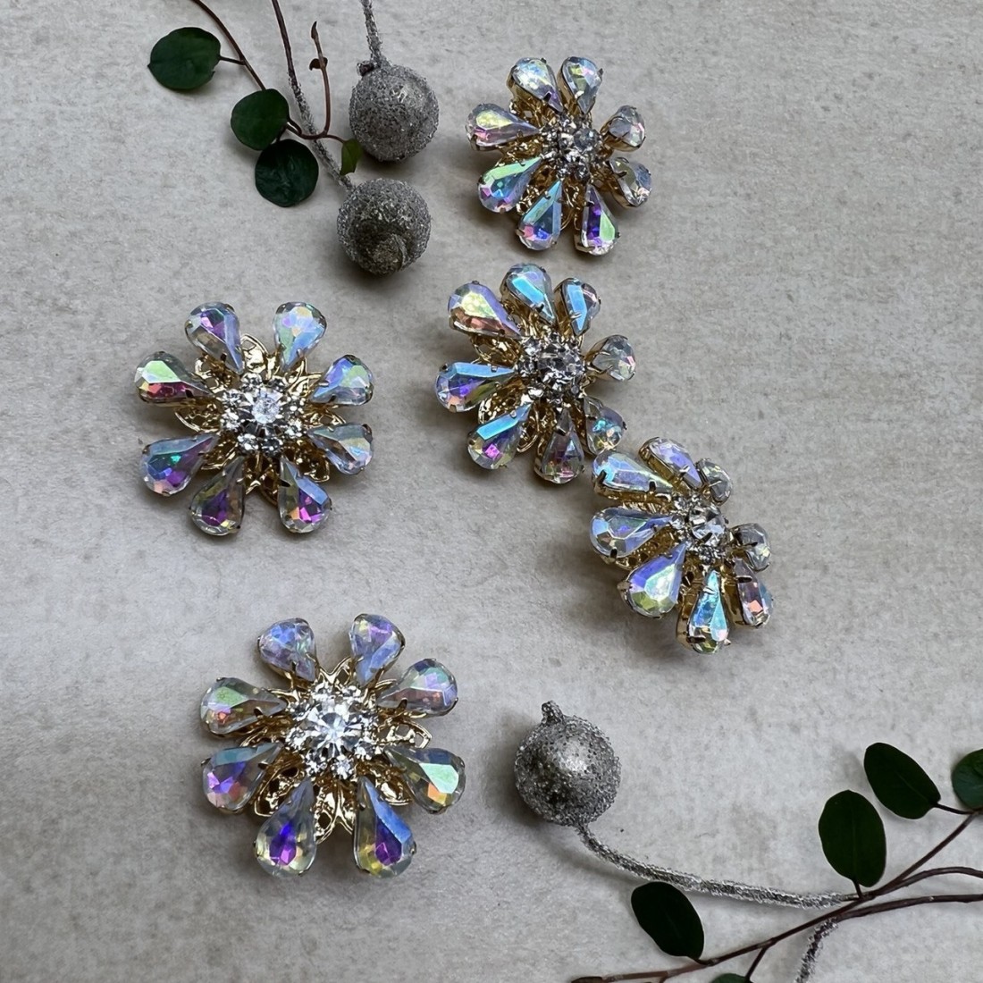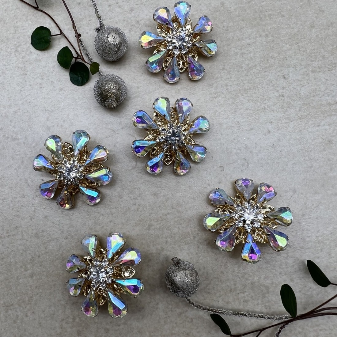 Крупные золотистые пуговицы в виде цветка со стразами цвета хамелеон.