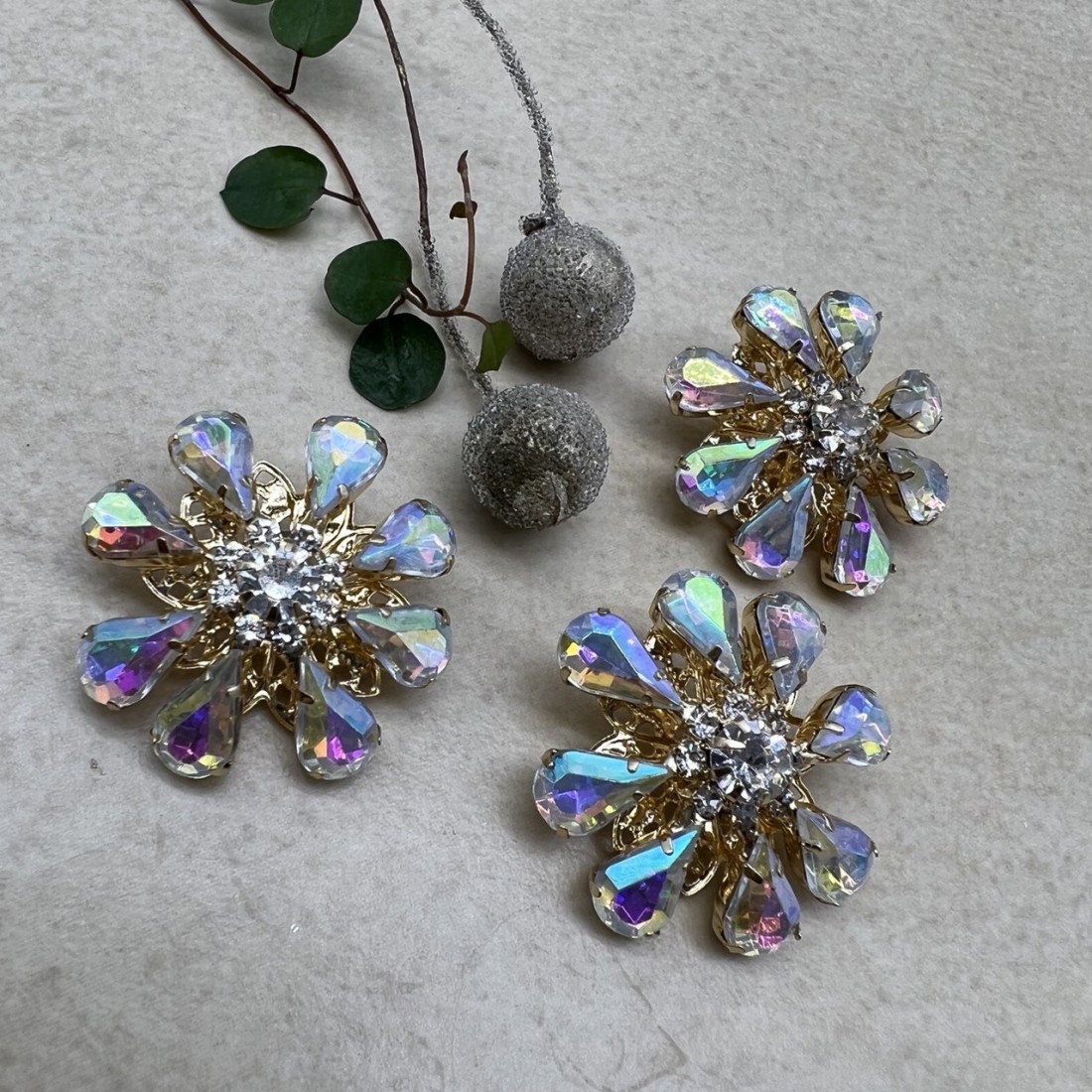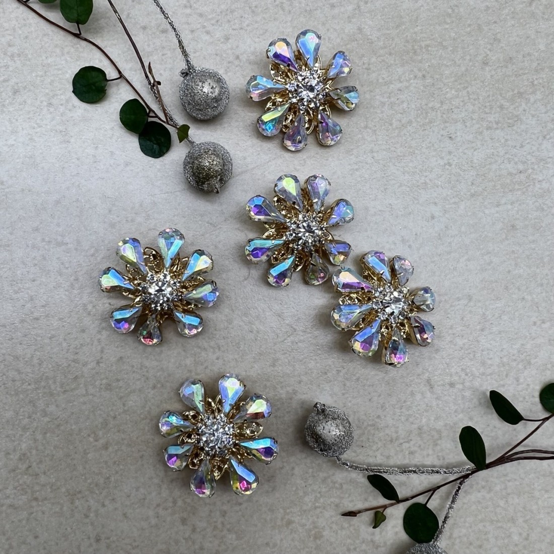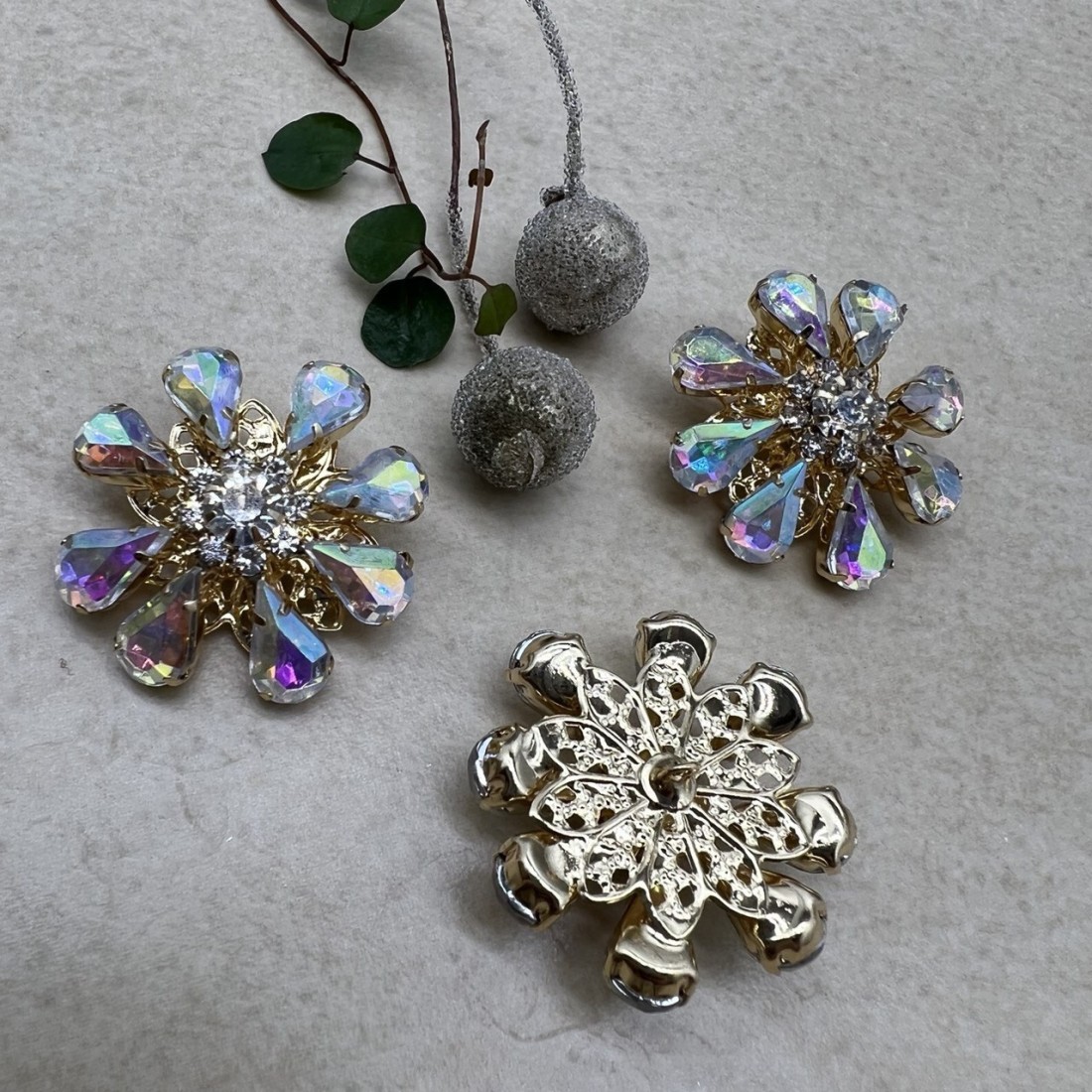 Крупные золотистые пуговицы в виде цветка со стразами цвета хамелеон.