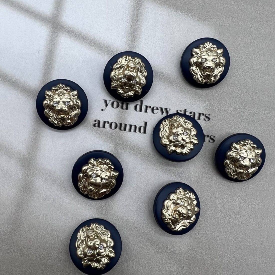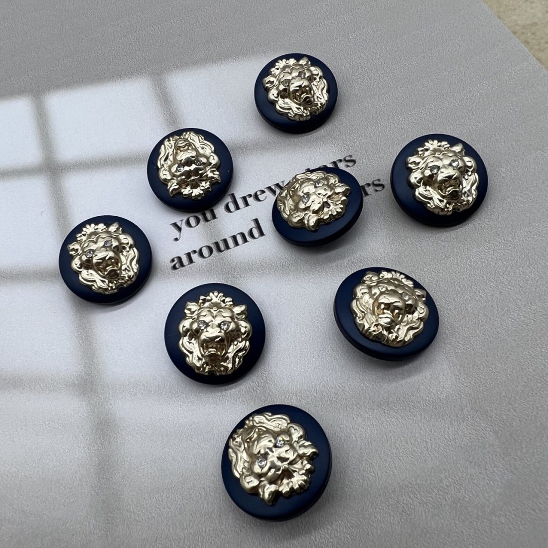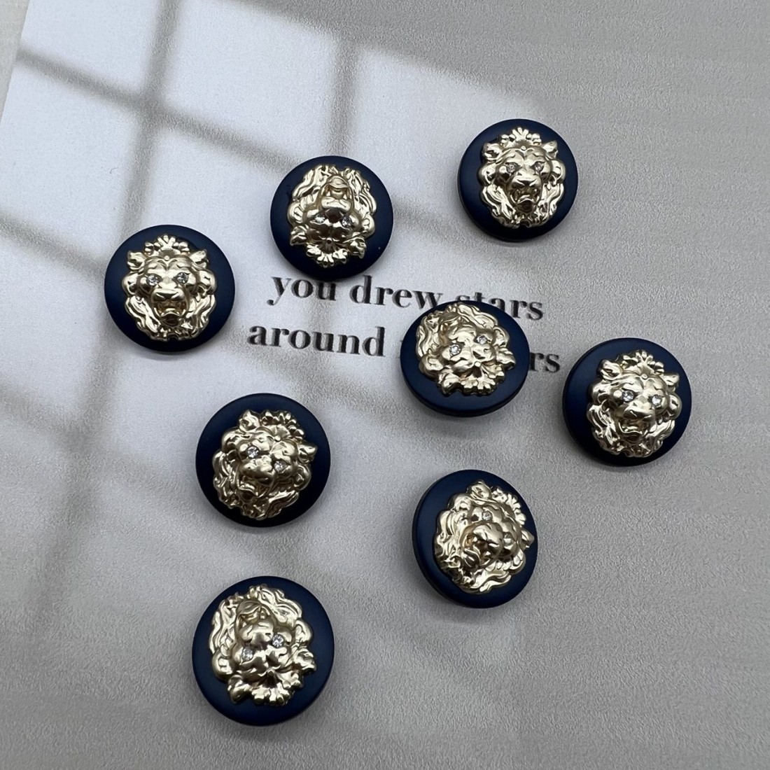Пуговицы легкие пластиковые на ножке, темно-синие с объёмными матово-золотистыми львами.