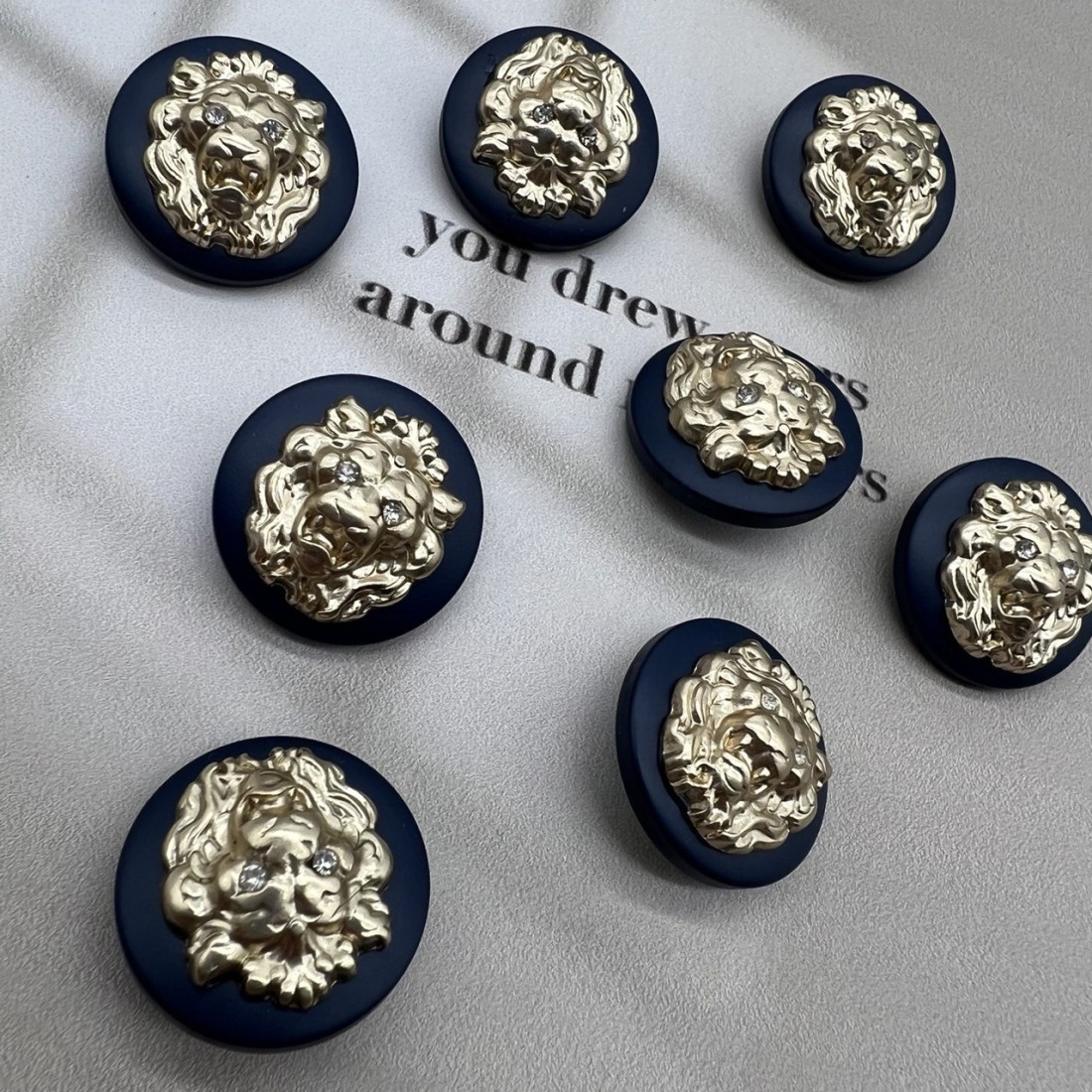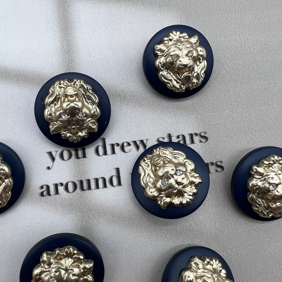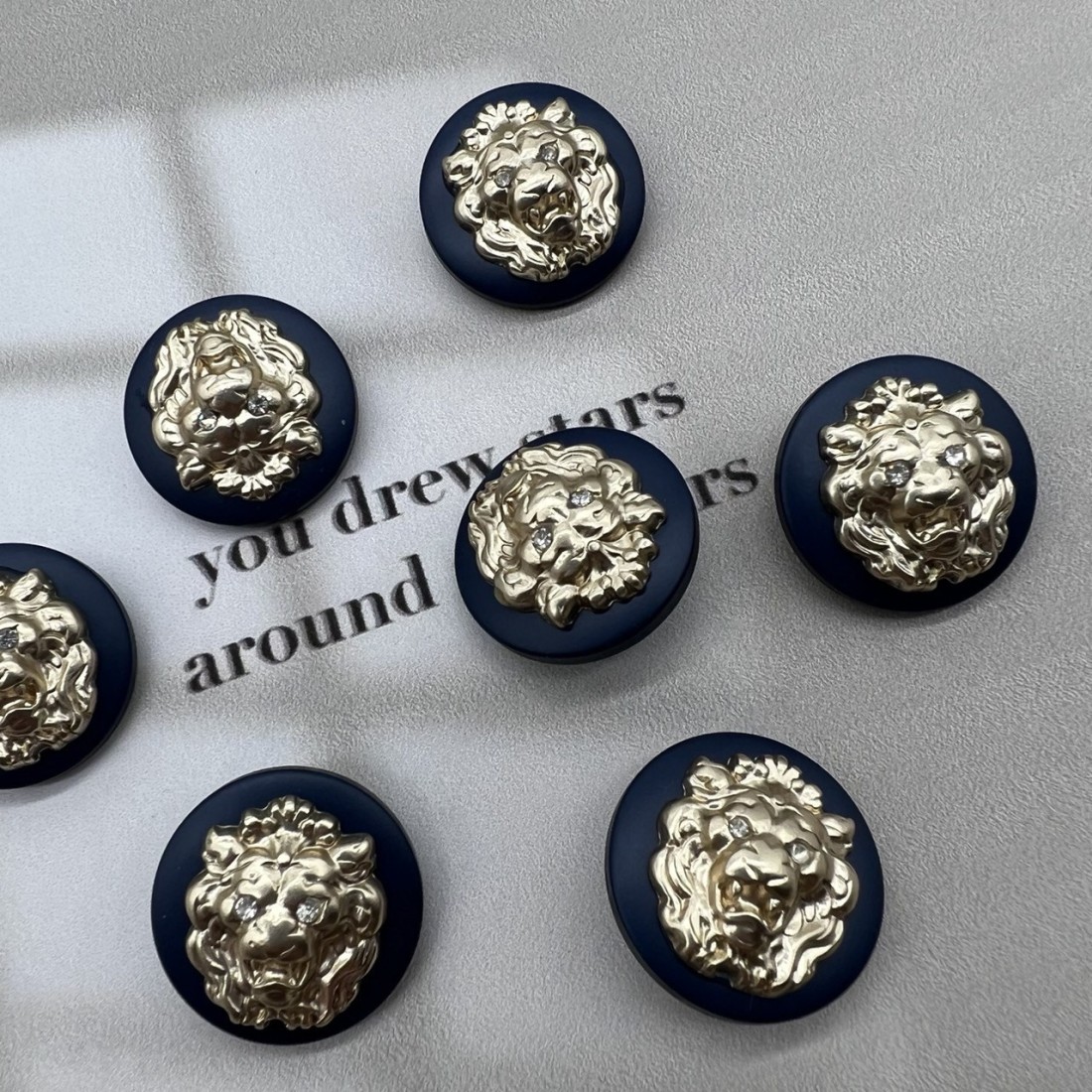 Пуговицы легкие пластиковые на ножке, темно-синие с объёмными матово-золотистыми львами.