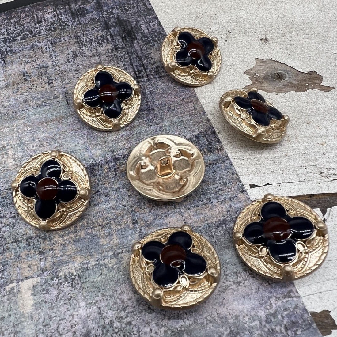 Пуговицы золотистые, с темной синей и бордовой эмалью, стильные и легкие.