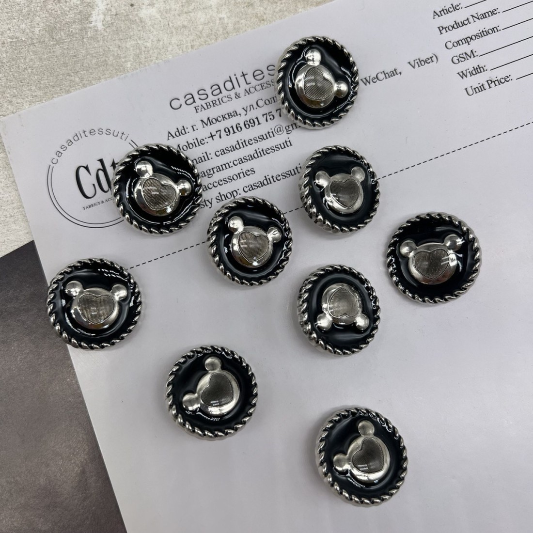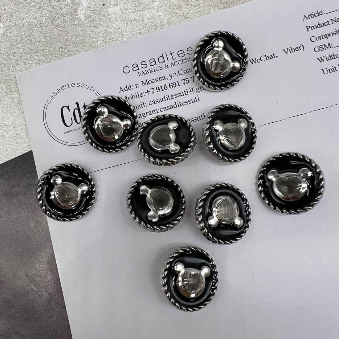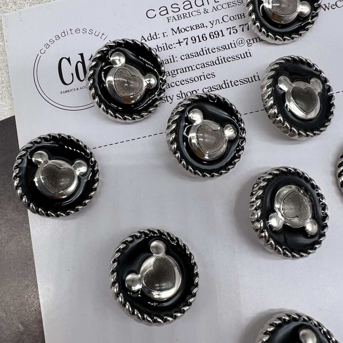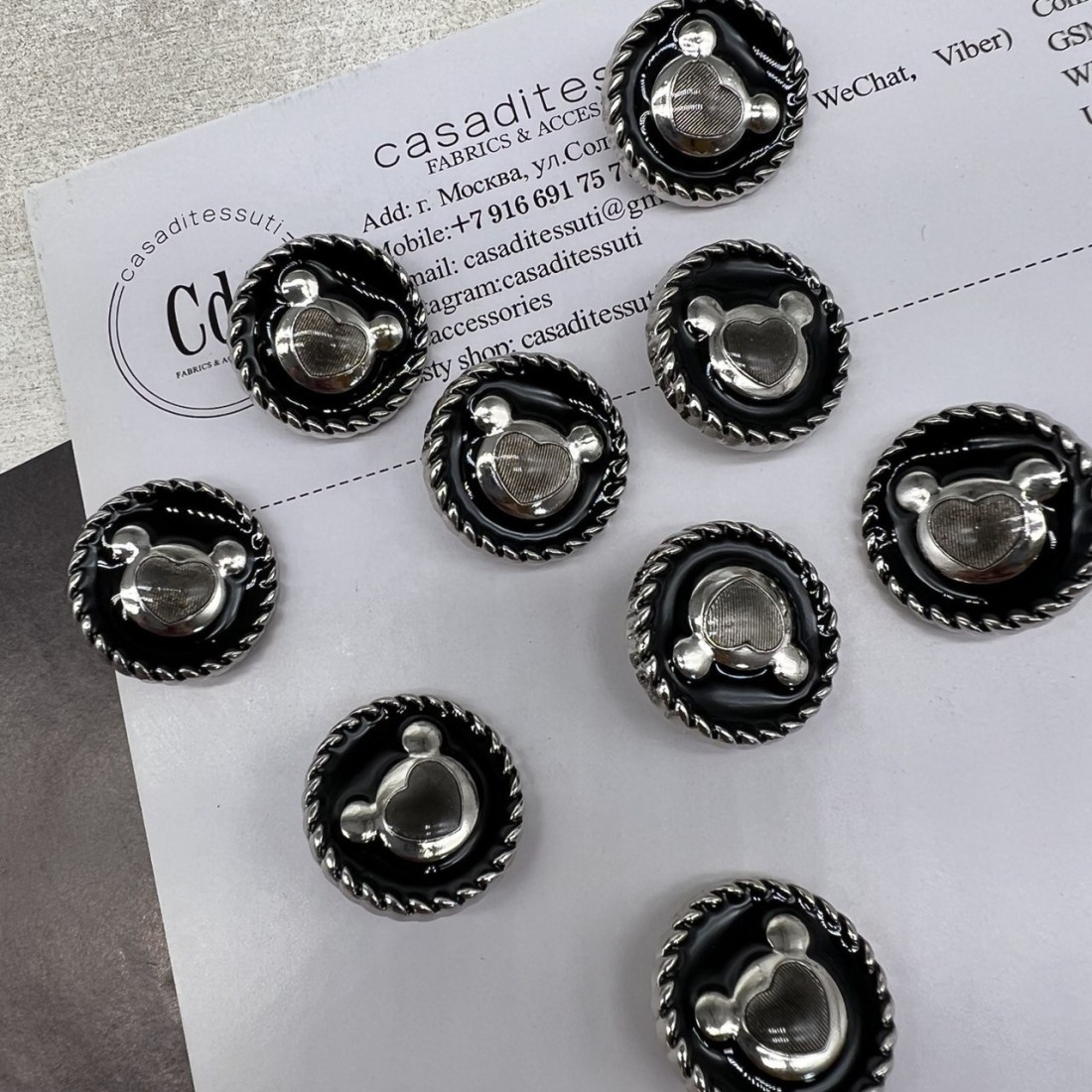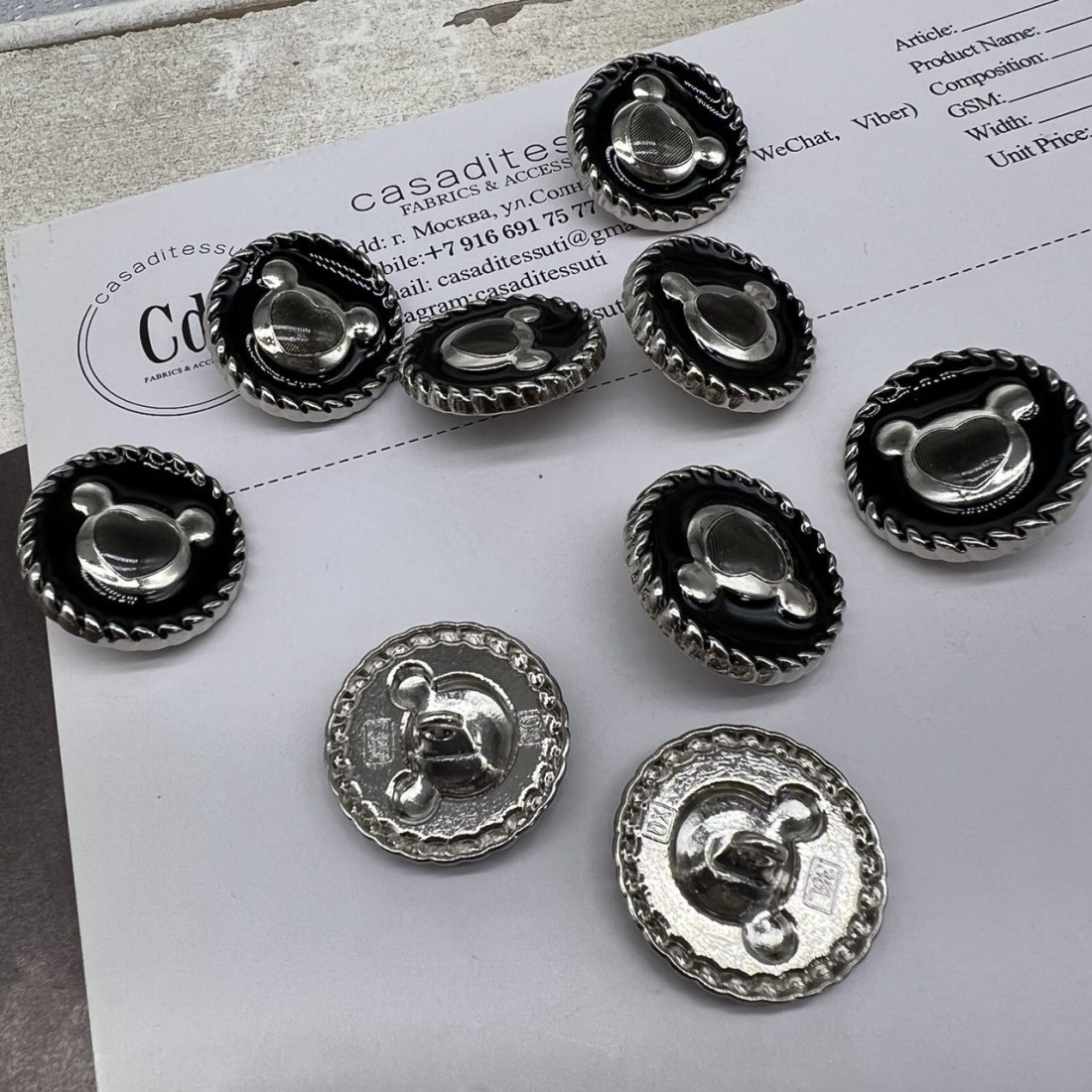 Пуговицы металлические серебристые матовые с мишками, покрытые черной эмалью.