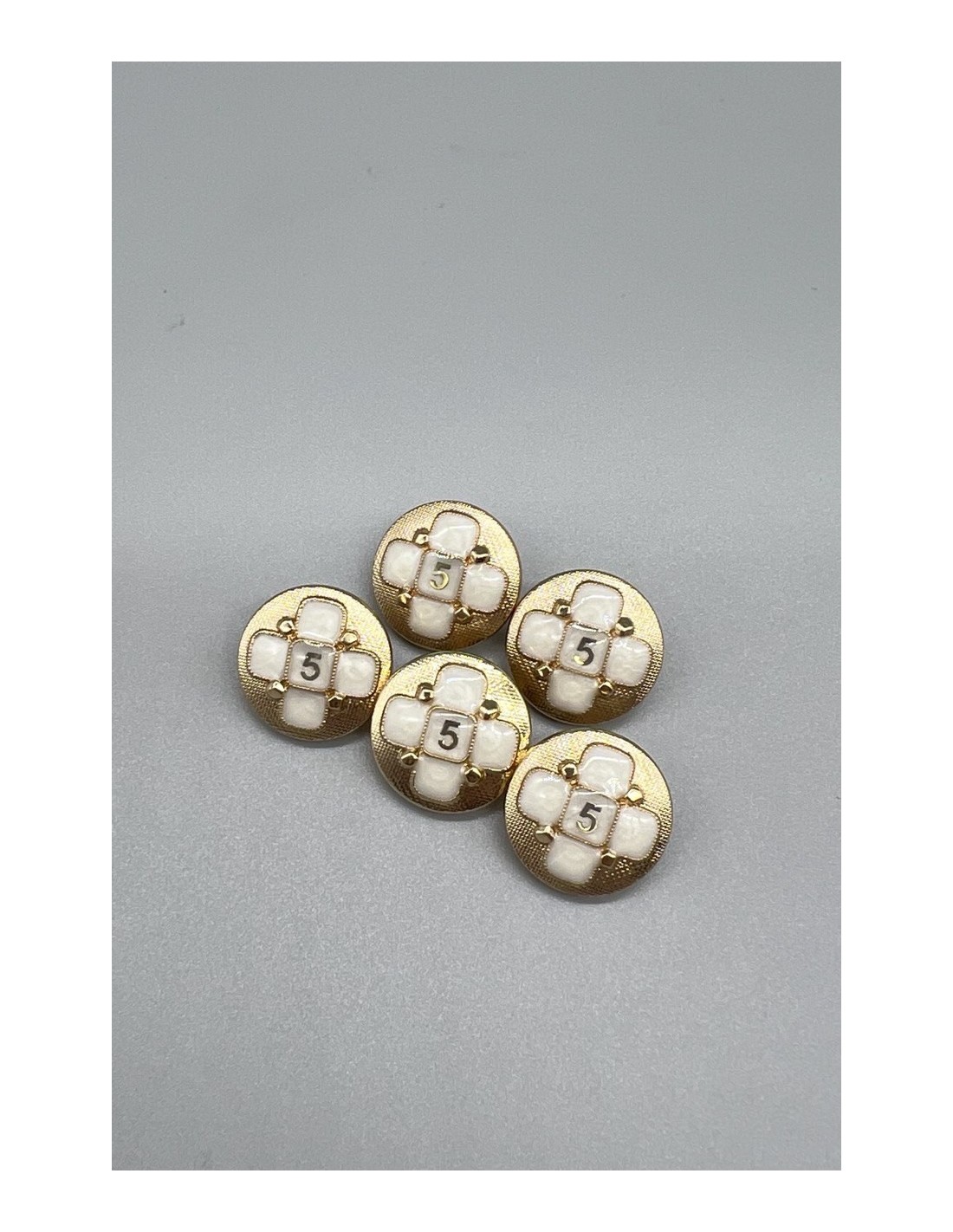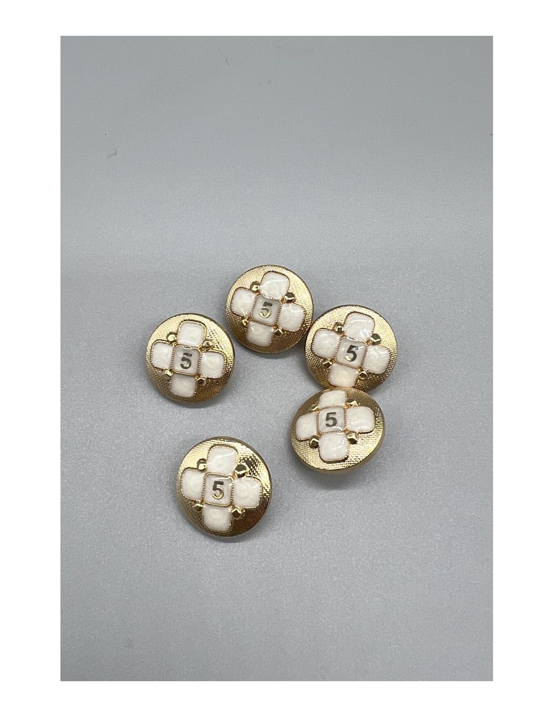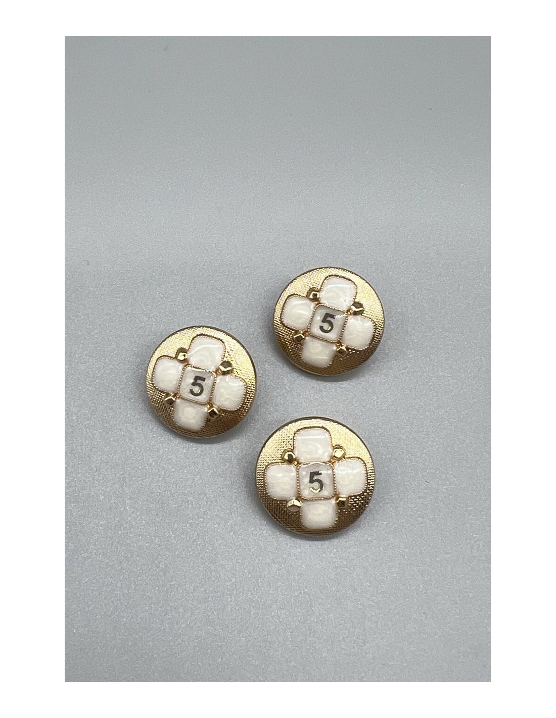 Пуговицы металлические золотистые с декоративными элементами в молочных тонах.