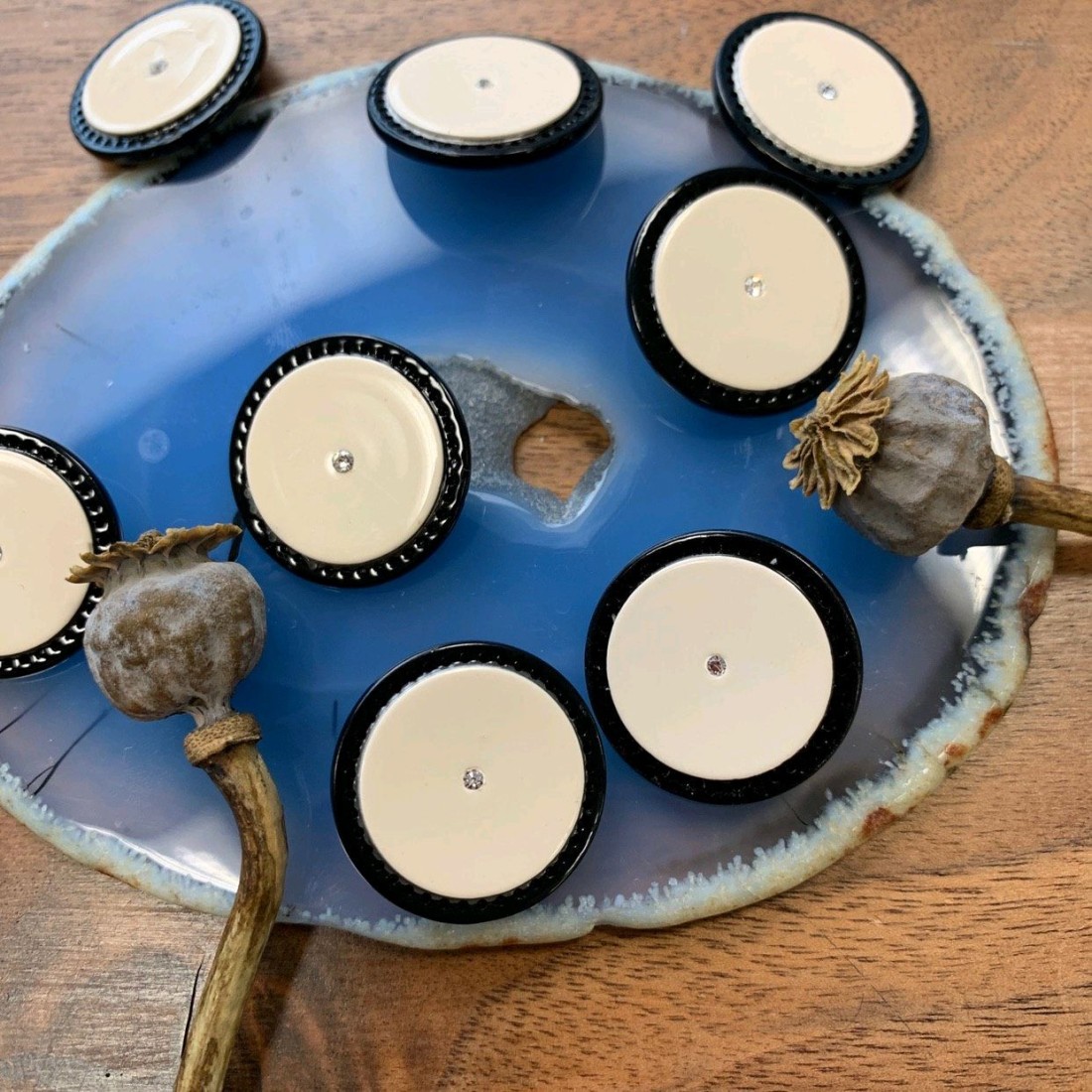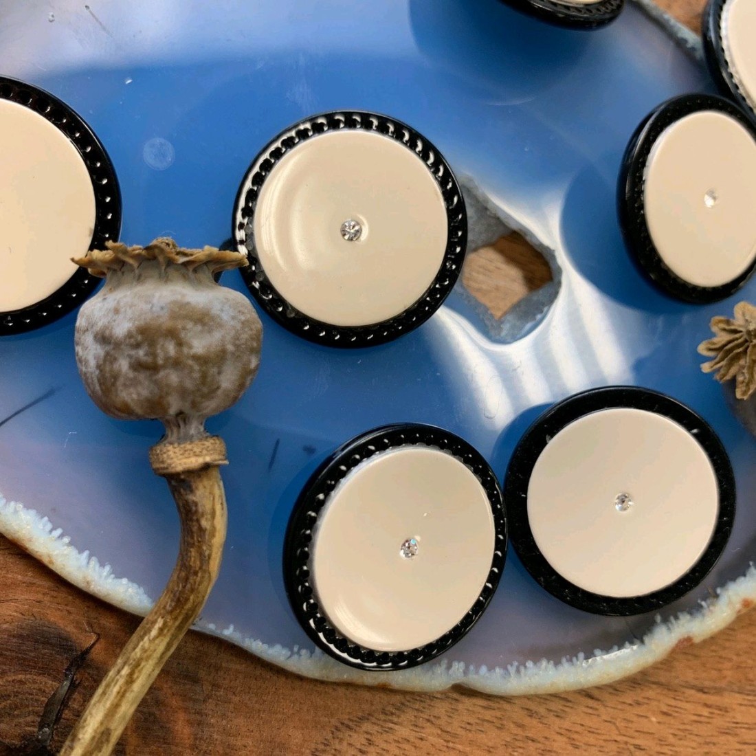 Пуговицы пластиковые цвета топлёного молока в черной оправе и камешком