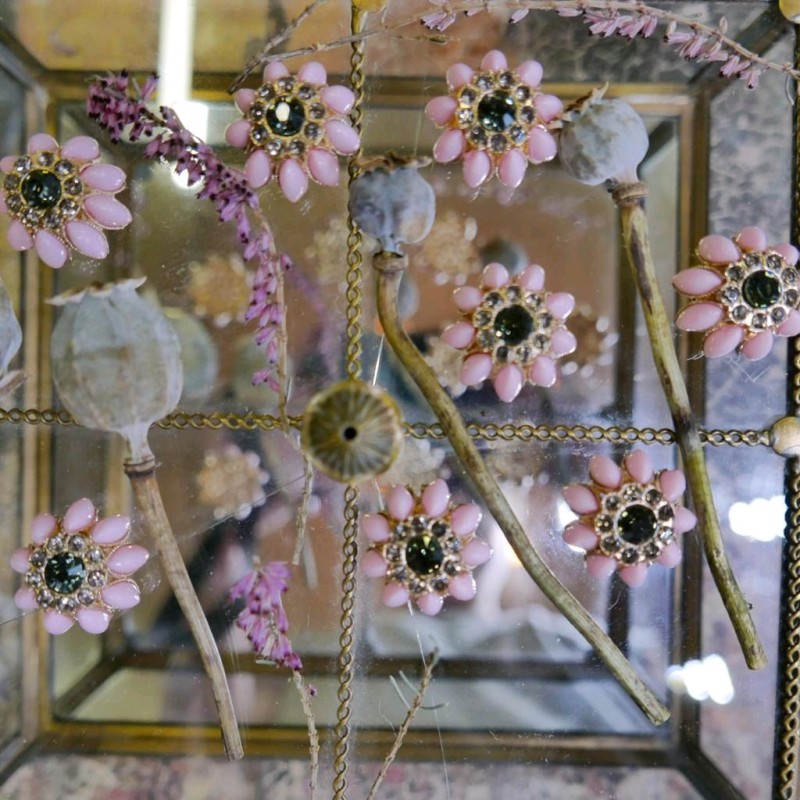 Пуговицы в стиле Dolce Gabbana розового цвета в оправе из золотого метала и серыми стразами.