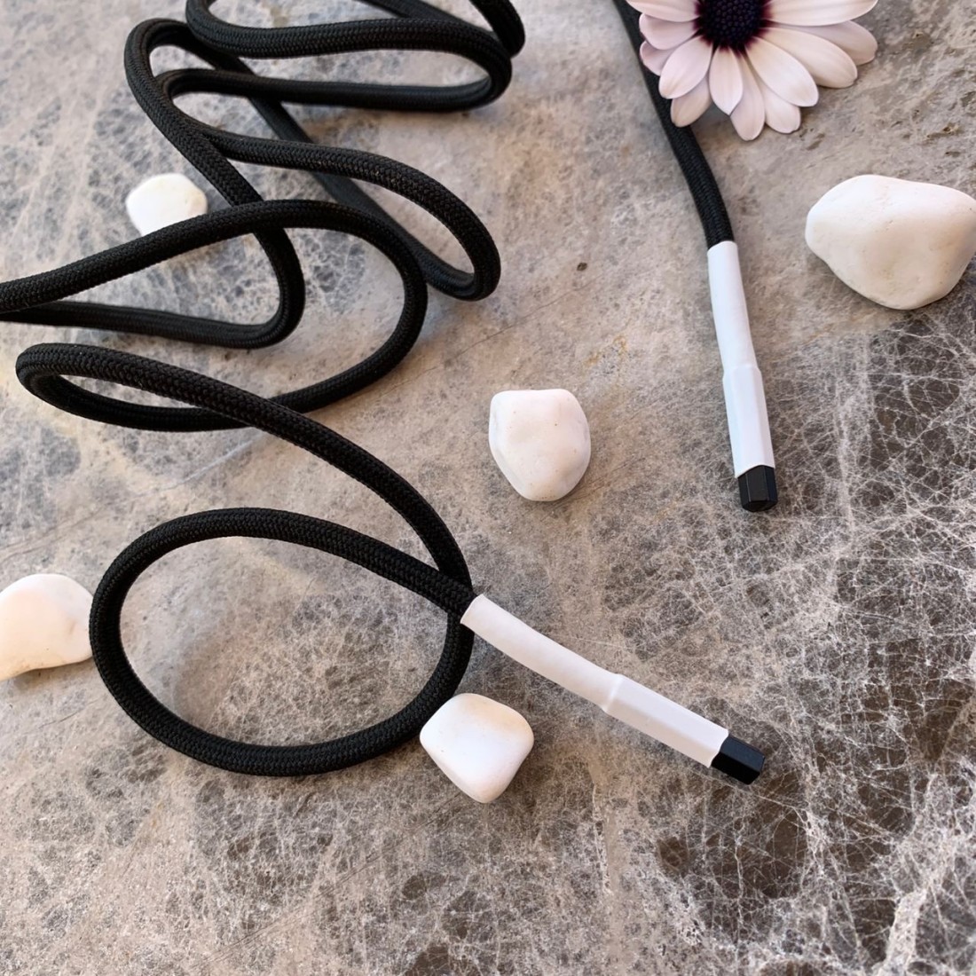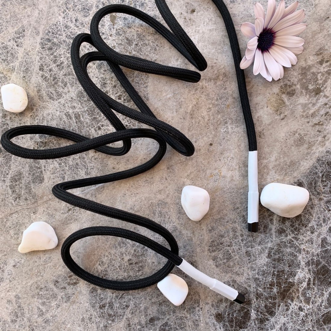 Чёрные трикотажные шнурки с прорезиненными концевиками белого цвета.