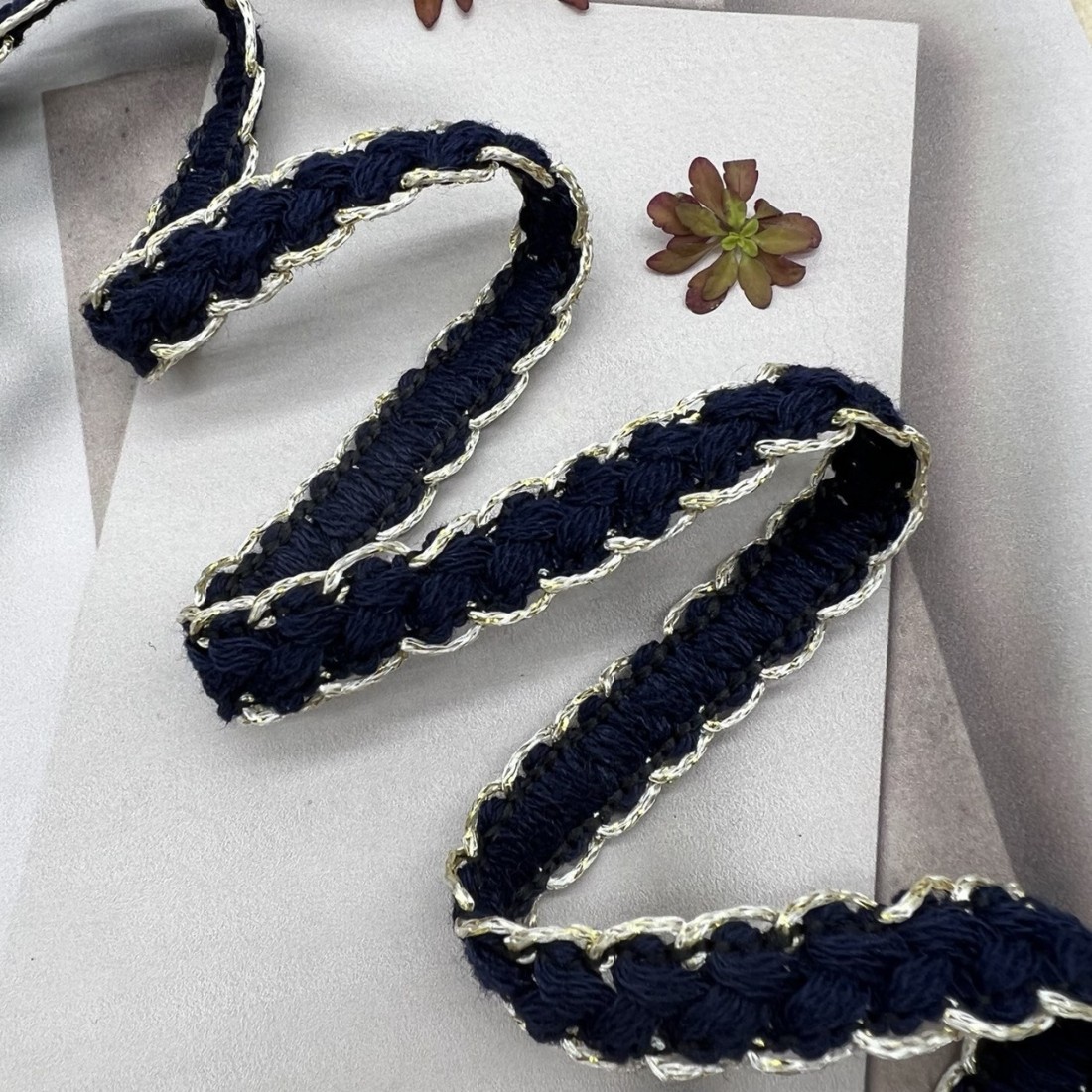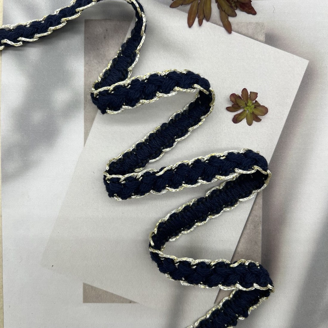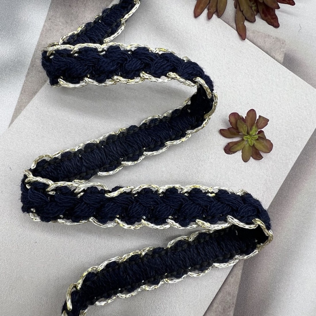 Мягкая декоративная тесьма темно-синего цвета, оплетённая золотистыми нитями.