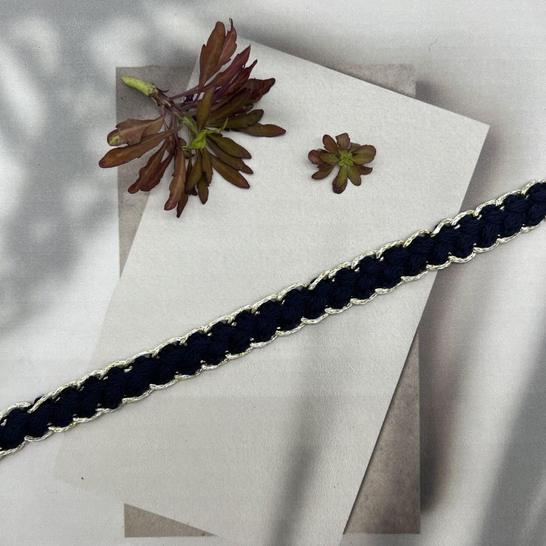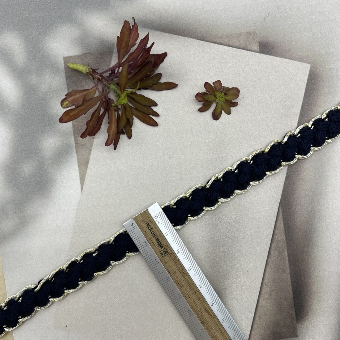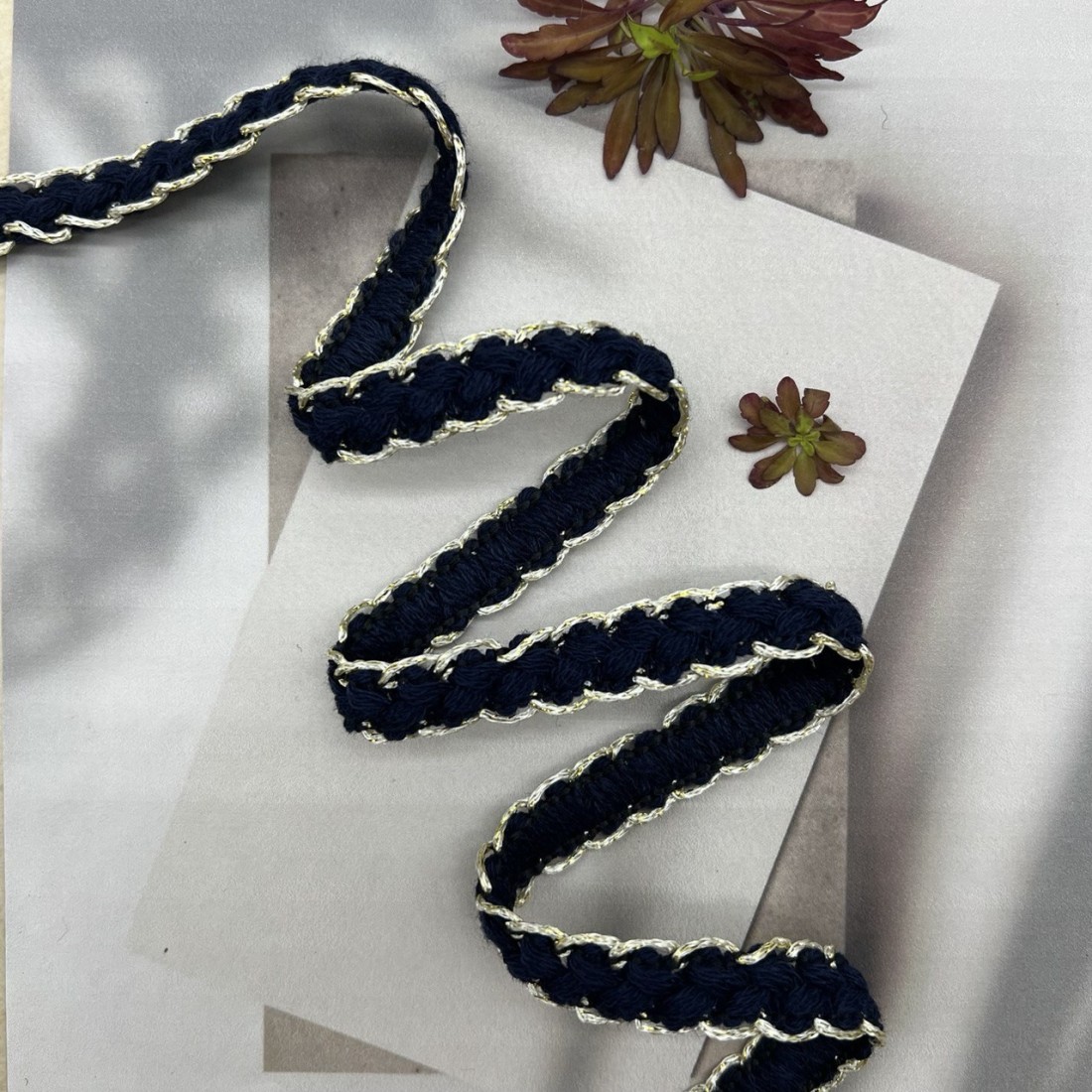 Мягкая декоративная тесьма темно-синего цвета, оплетённая золотистыми нитями.
